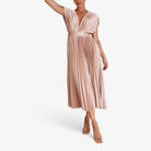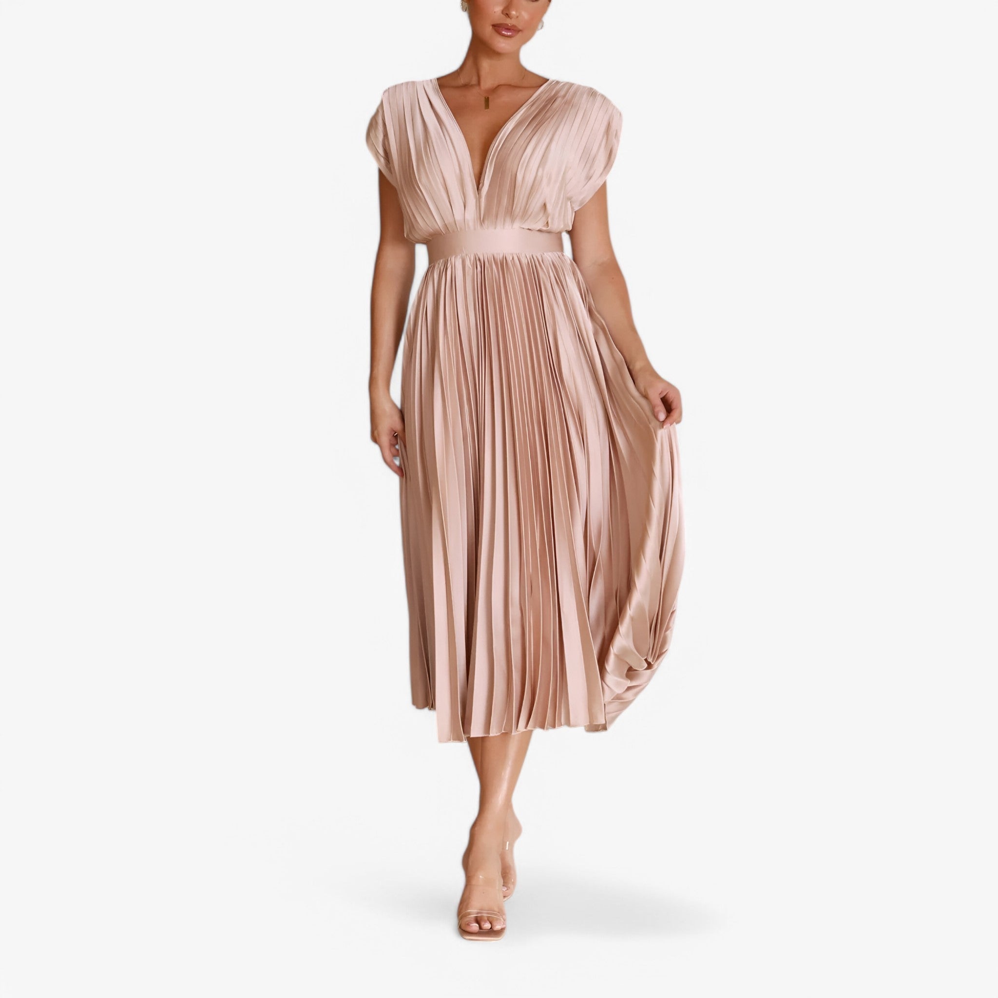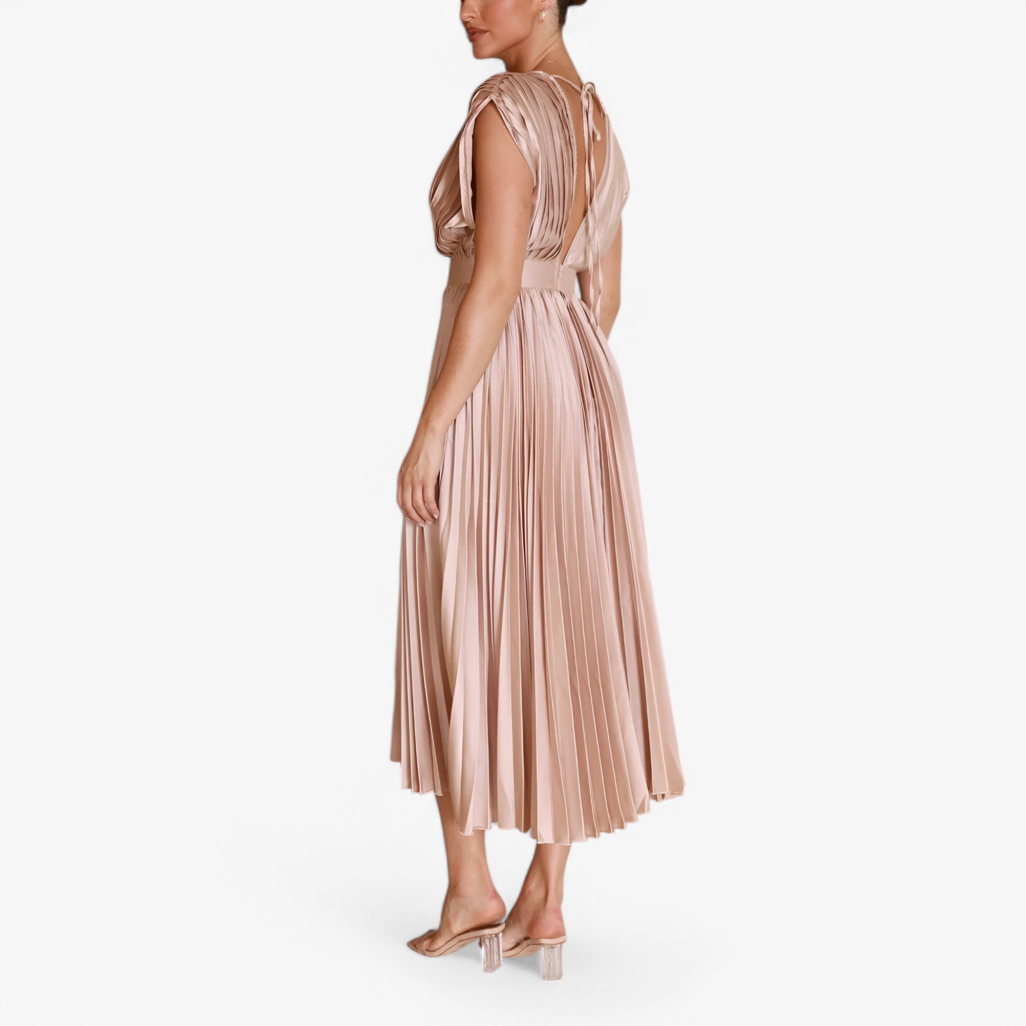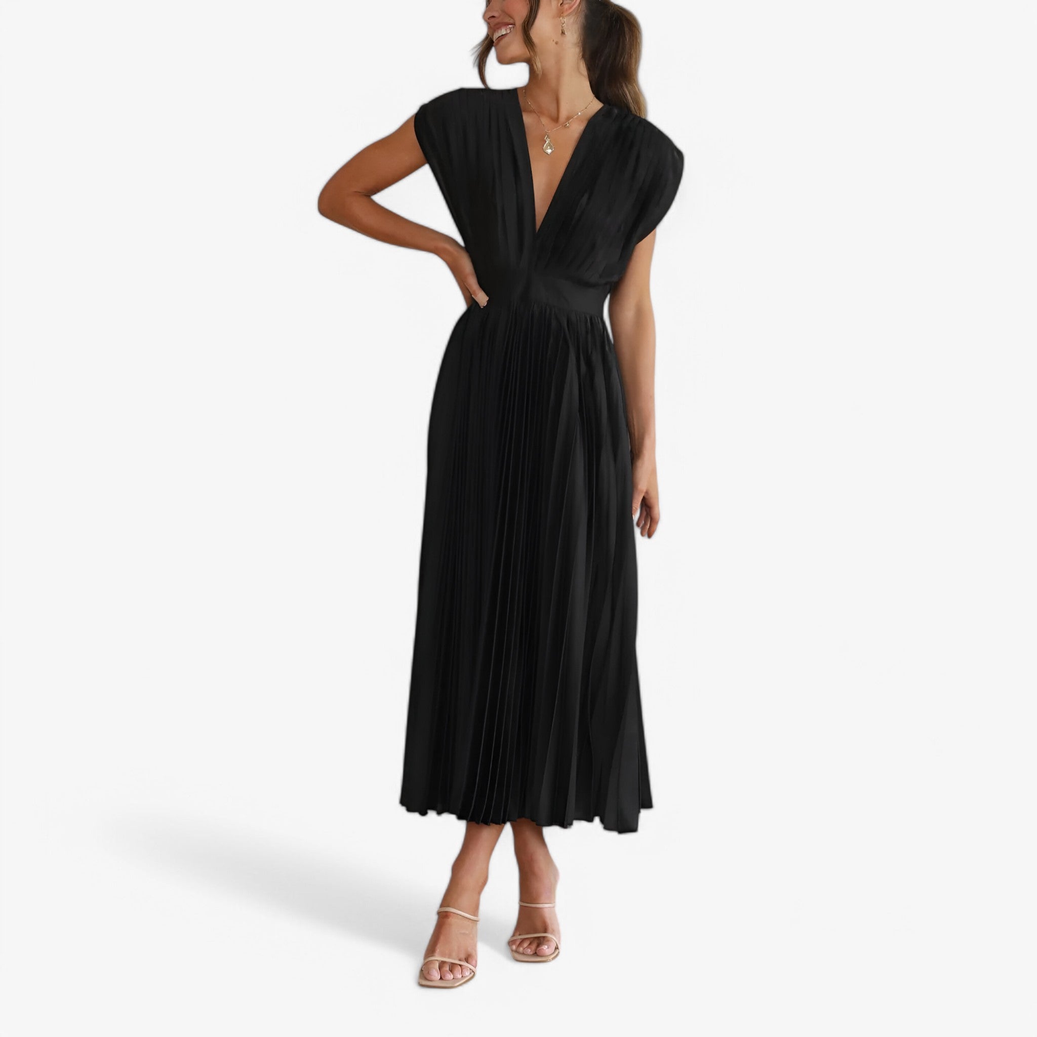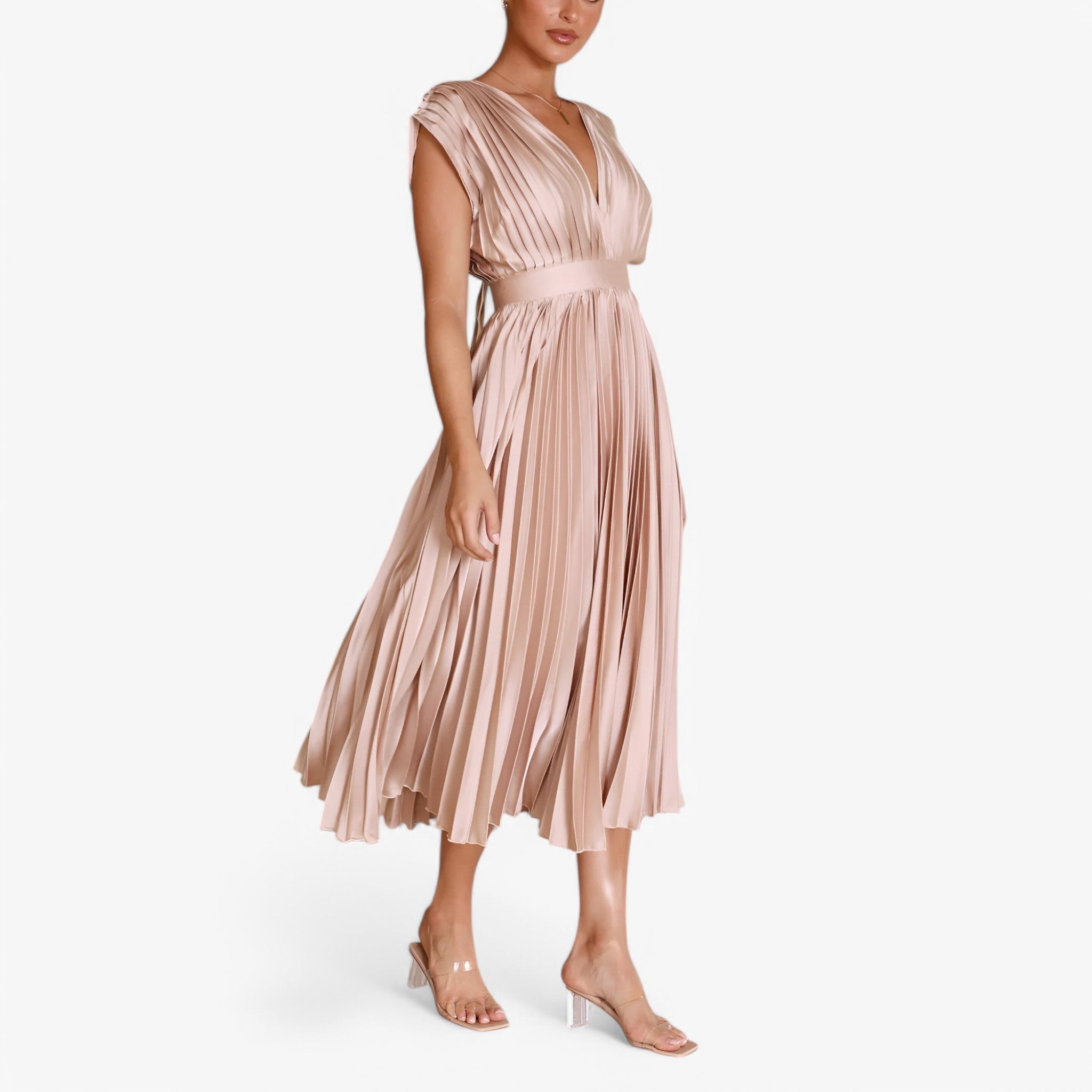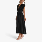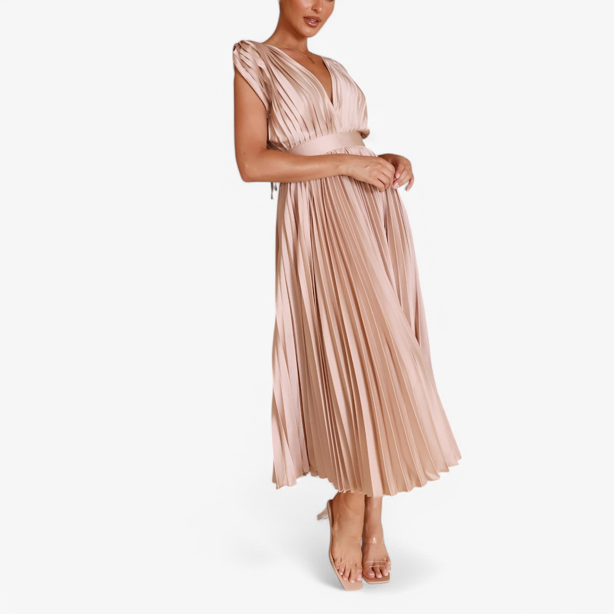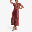 The pleated design of this maxi dress flows gracefully with every step, creating an elegant and feminine silhouette. The draped V-neckline and high waist accentuate your figure and make you feel beautiful just as you are.