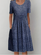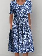 This is a comfortable dress with a loose fit and a round neckline. The dress has short sleeves and falls just over the knee. The floral pattern gives it a fresh and calm appearance. The fabric is a cotton blend, which ensures comfortable wear and easy maintenance.
