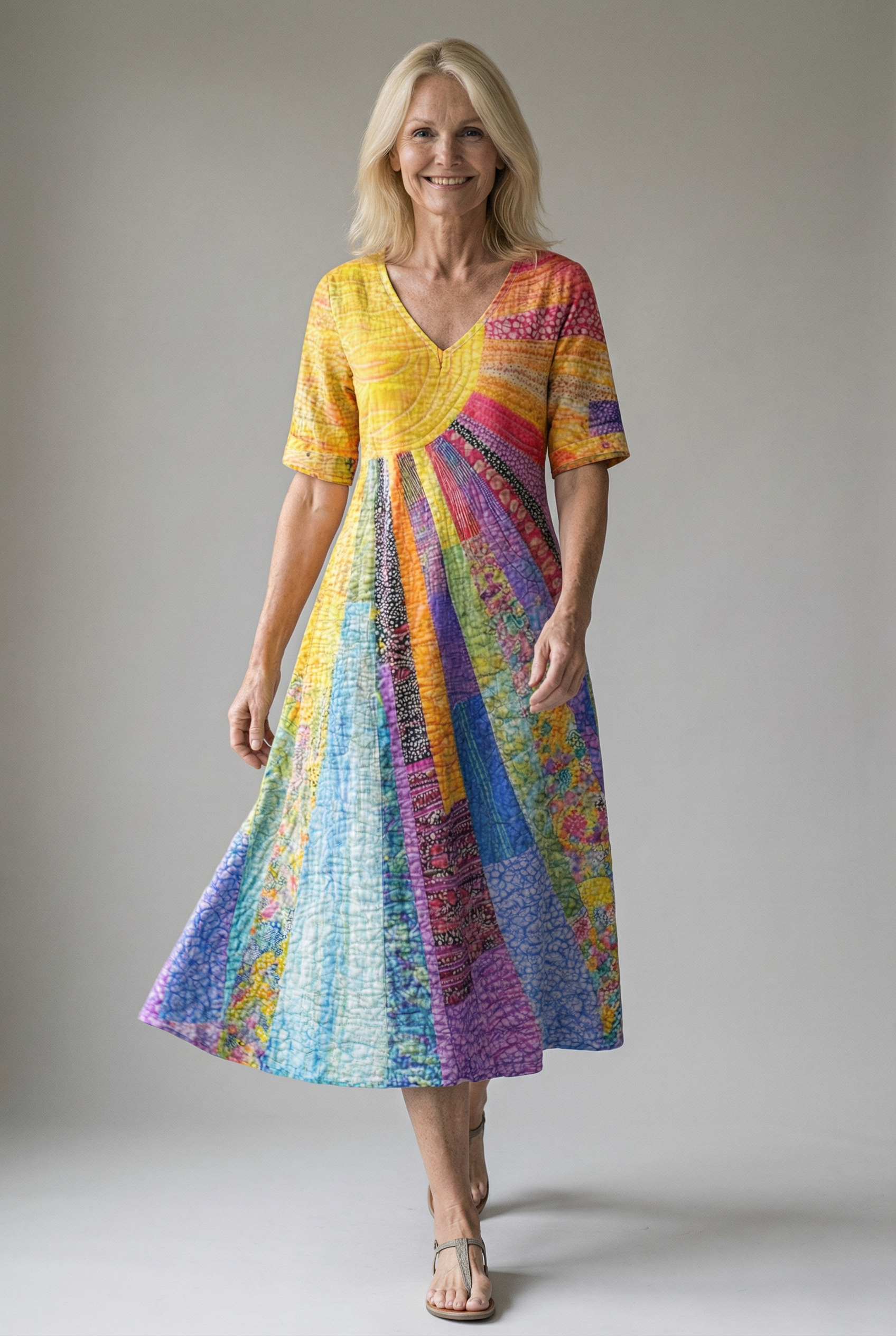 This dress brings together refined bohemian character and an easy, graceful silhouette. Crafted from a breathable cotton–linen fabric, it drapes softly while the midi length, V-neckline, and long sleeves create a polished yet relaxed look. Subtle artistic details give the dress its distinctive feel, making it ideal for everyday wear with a touch of individuality.