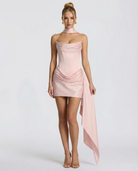 A refined mini corset dress designed to sculpt and flatter. The Blush Hour Mini features a structured corset bodice that defines the waist, a soft draped neckline, and an elegant asymmetric sash detail that adds movement and sophistication. Finished with a lace-up back for an adjustable, feminine fit. Perfect for evenings, celebrations, and elevated occasions where elegance meets confidence.